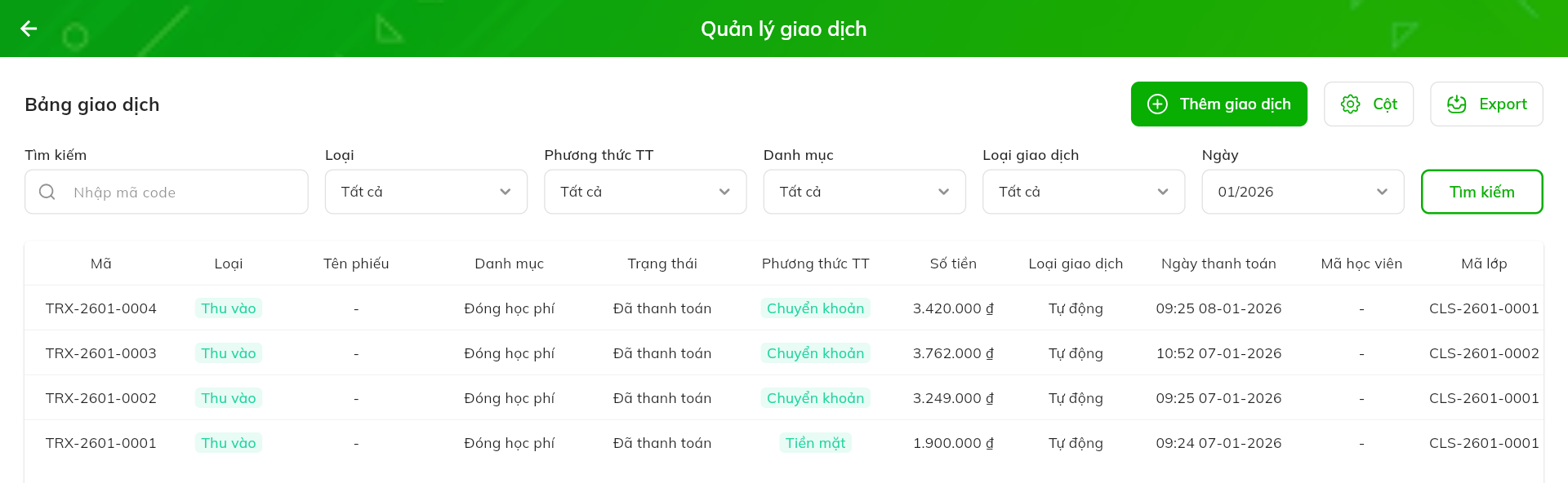 Kiểm soát tài chính & Giao dịch: Mọi khoản học phí và giao dịch được hệ thống ghi nhận theo thời gian thực (Real-time). Chủ trung tâm có thể theo dõi dòng tiền và công nợ mà không cần đợi báo cáo thủ công cuối tháng.