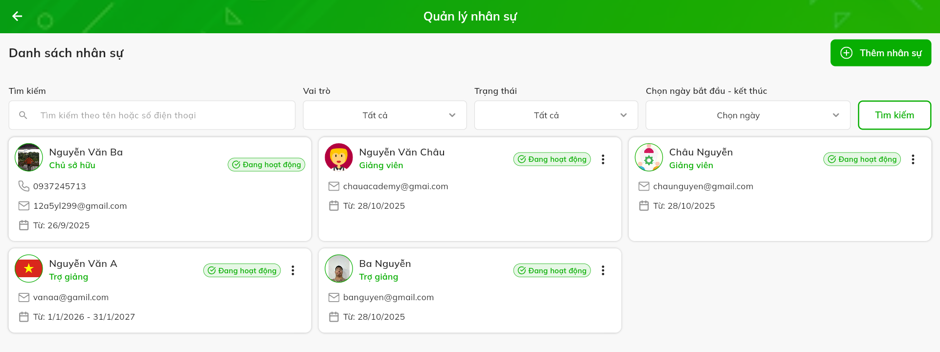 - Hệ thống quản trị nhân sự & Học viên: Giúp bạn lưu trữ toàn bộ data HLV, trợ giảng và học viên một cách khoa học. Mọi thông tin liên lạc, trạng thái hoạt động đều hiển thị minh bạch, loại bỏ hoàn toàn việc quản lý qua các file Excel rời rạc.