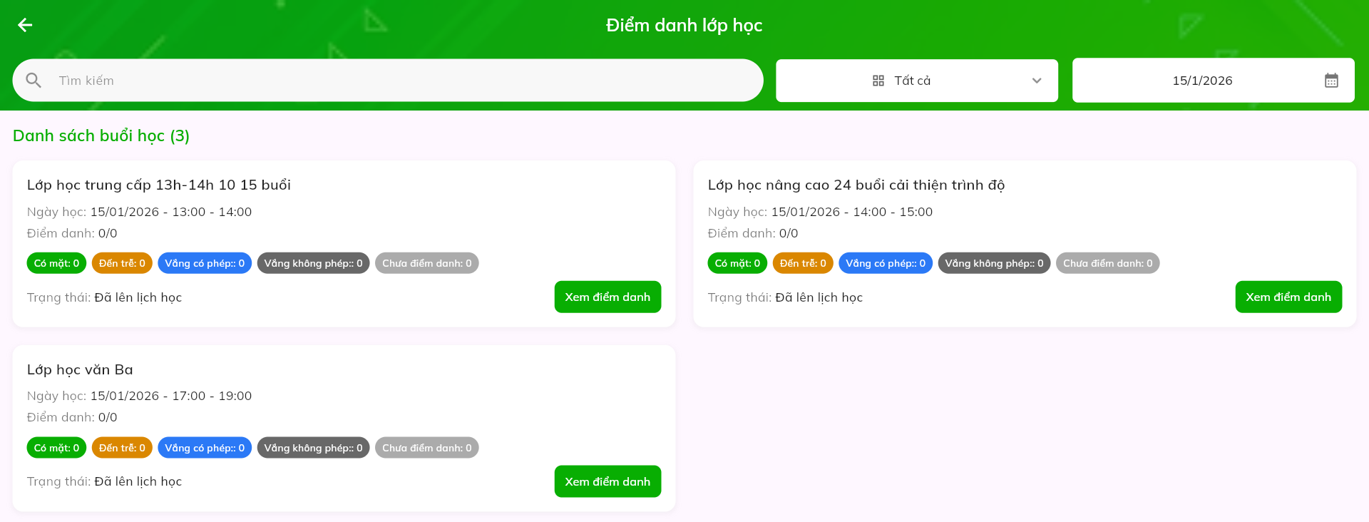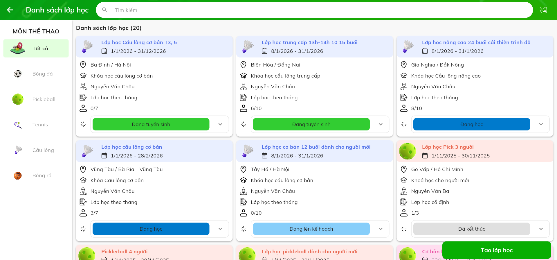 Quản lý lớp học & Khóa học: Giúp chủ trung tâm nắm bắt ngay lập tức lớp nào đang “Tuyển sinh”, lớp nào “Đang học” và số lượng học viên thực tế trên mỗi lớp.