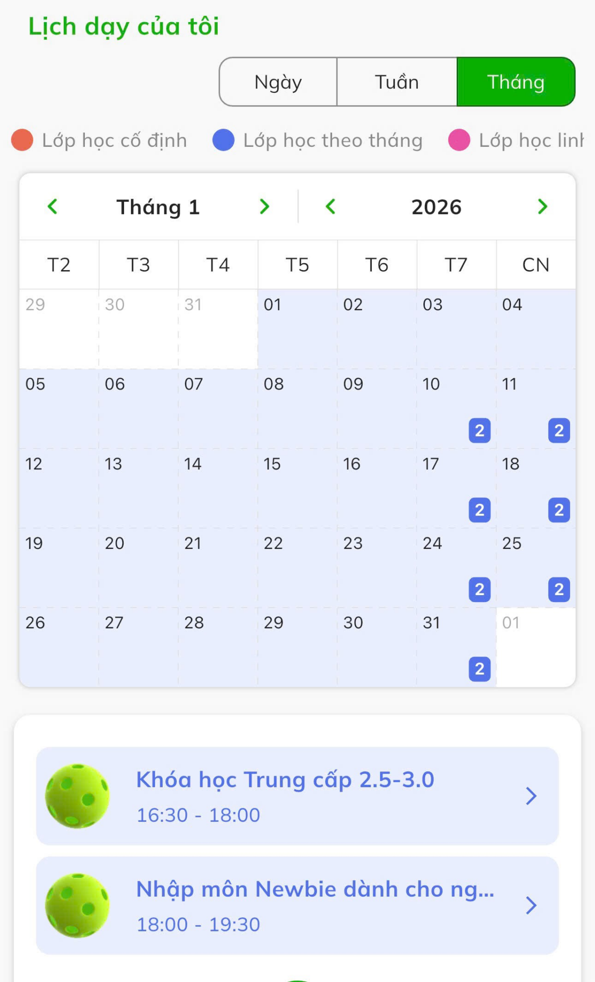 Lịch dạy thông minh (Calendar): Toàn bộ lịch trình dạy theo ngày, tuần, tháng được hiển thị trực quan qua các khối màu. HLV luôn biết chính xác khung giờ nào mình có lớp, sân tập ở đâu để luôn chủ động trong công việc.