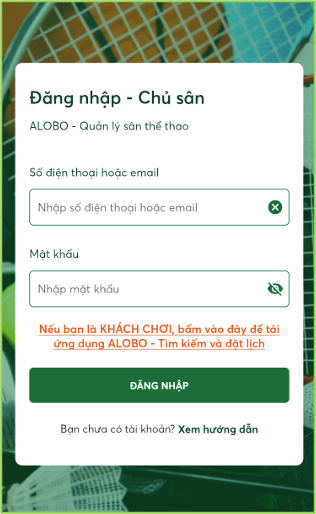 Bước 1: Đăng nhập vào ứng dụng “ALOBO – quản lý sân thể thao” hoặc trang web ALOBO: app.alobo.vn. Nhập Tên người dùng và Mật khẩu -> Chọn “Đăng nhập”