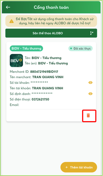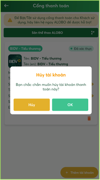 – Anh chị chủ sân có thể Huỷ các tài khoản BIDV đang liên kết và giữ lại các tài khoản ngân hàng đang sử dụng. Trường hợp tắt hết các tài khoản hoạt động, hệ thống sẽ trở về luồng đặt lịch cũ là Tải hình ảnh chuyển khoản ngân hàng.