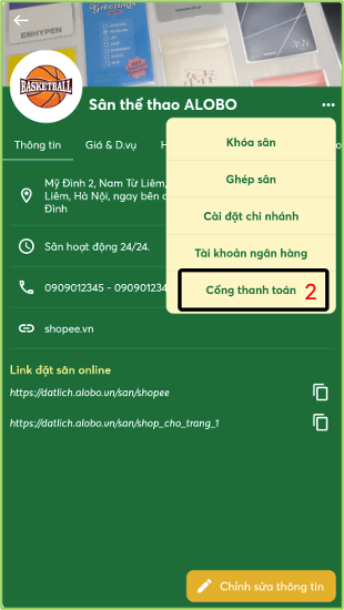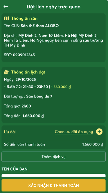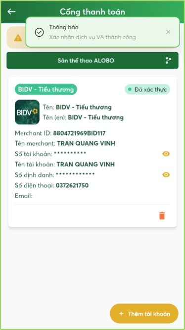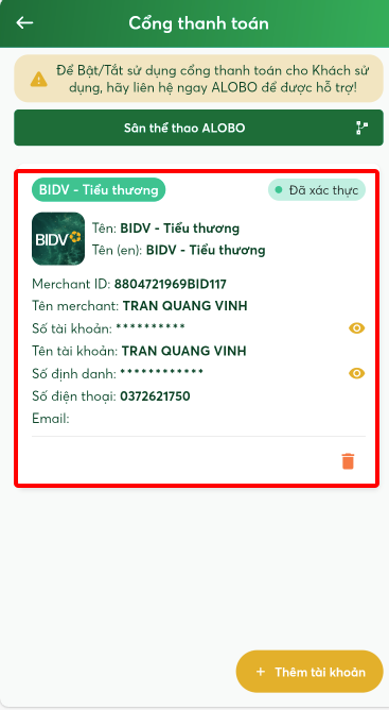 + Chủ sân có sử dụng tài khoản ngân hàng của BIDV
