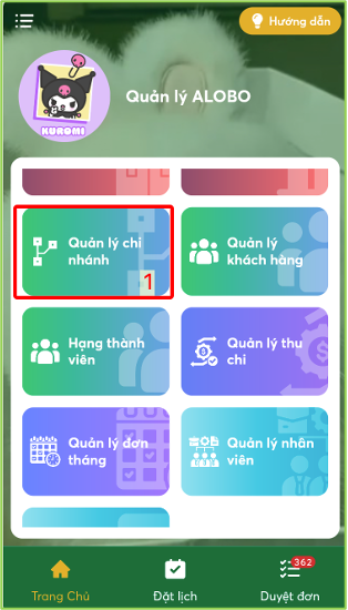 Bước 2: Tại màn hình trang chủ -> chọn Quản lý chi nhánh (1) -> Chọn chi nhánh -> Chọn Menu cài đặt “Cổng thanh toán” (2)