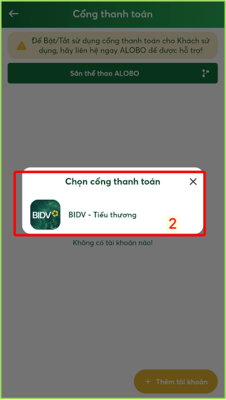 Bước 3: Chọn “Thêm tài khoản” (1) -> Chọn cổng thanh toán “BIDV – Tiểu thương” (2) -> Nhập thông tin (3)